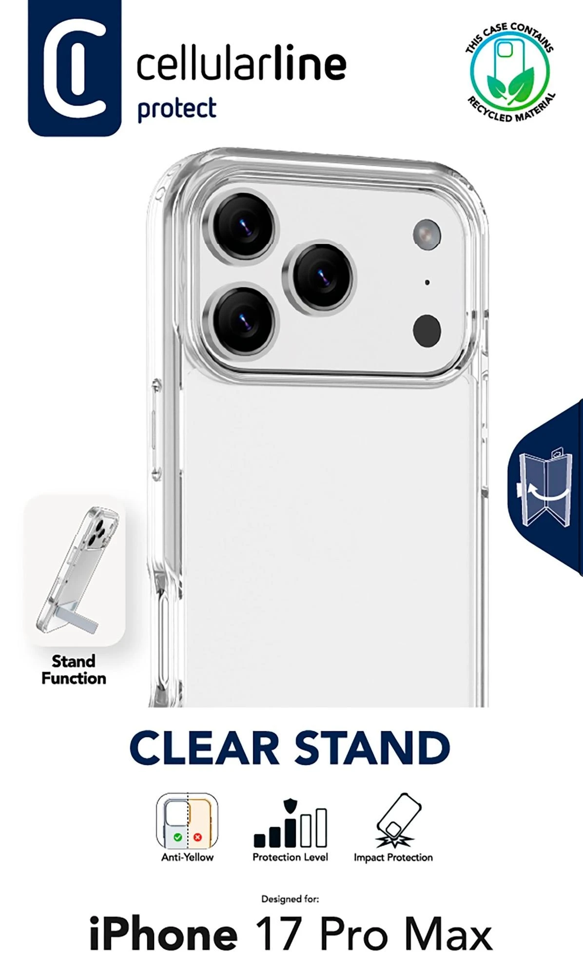 Clear Stand ist die transparente Schutzhülle mit integriertem Standfuß – ideal für freihändiges Telefonieren, Streaming oder Arbeiten. Sie besteht aus einem harten Rücken und stoßdämpfendem Gummirahmen und schützt zuverlässig vor Stößen und Stürzen. Erhöhte Kanten schützen Bildschirm und Kamera. Die antibakterielle Oberfläche und das Anti-Vergilbungs-Material sorgen für dauerhafte Hygiene und Klarheit.